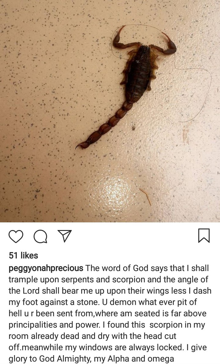 "U demon what ever pit of hell u r been sent from, where am seated is far above principalities and power. I found this scorpion in my room already dead and dry with the head cut off. meanwhile my windows are always locked. I give glory to God Almighty, my Alpha and omega."